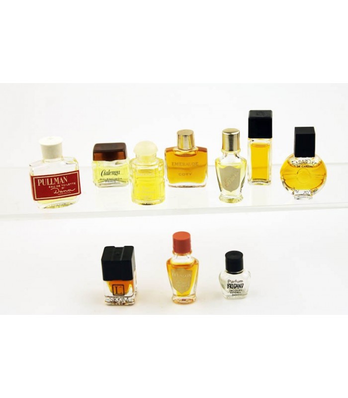 Lot de 10 miniatures sans boite ( L^ Sikkim de Lancôme P 1.5 ml, Arpège de Lanvin P 2ml, Paradoxe de Cardin P 2ml, Ecusson d'Albret P 2ml, Emeraude de Coty P 2.5ml, Cialenga de Balenciaga P 2ml, Brigand de Estérel P 1.4 gr, Amazone d'Hermes Edp 2.5ml, Pri